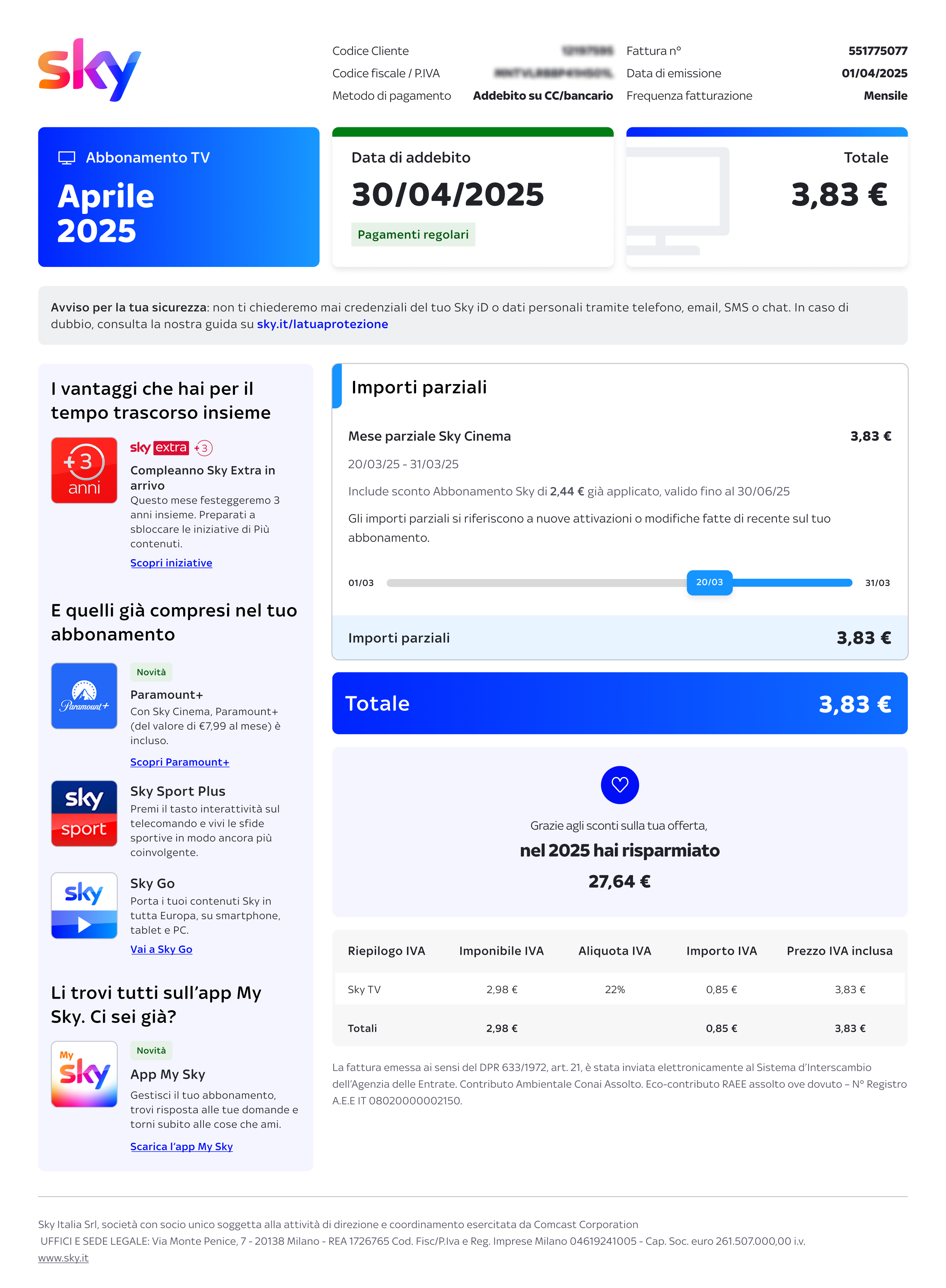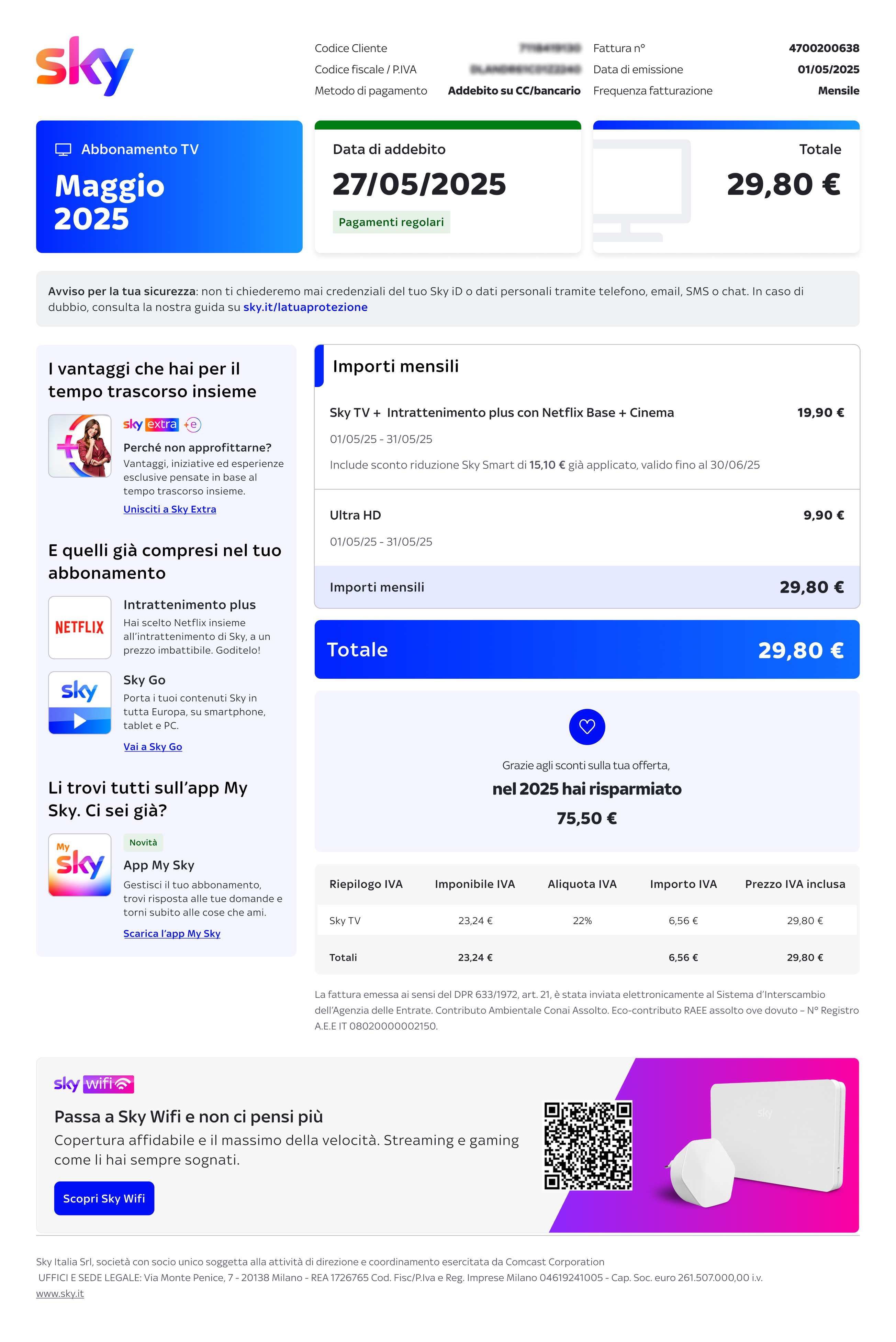 - all’ app My Sky > vai in Gestisc i > A portata di mano > Fatture