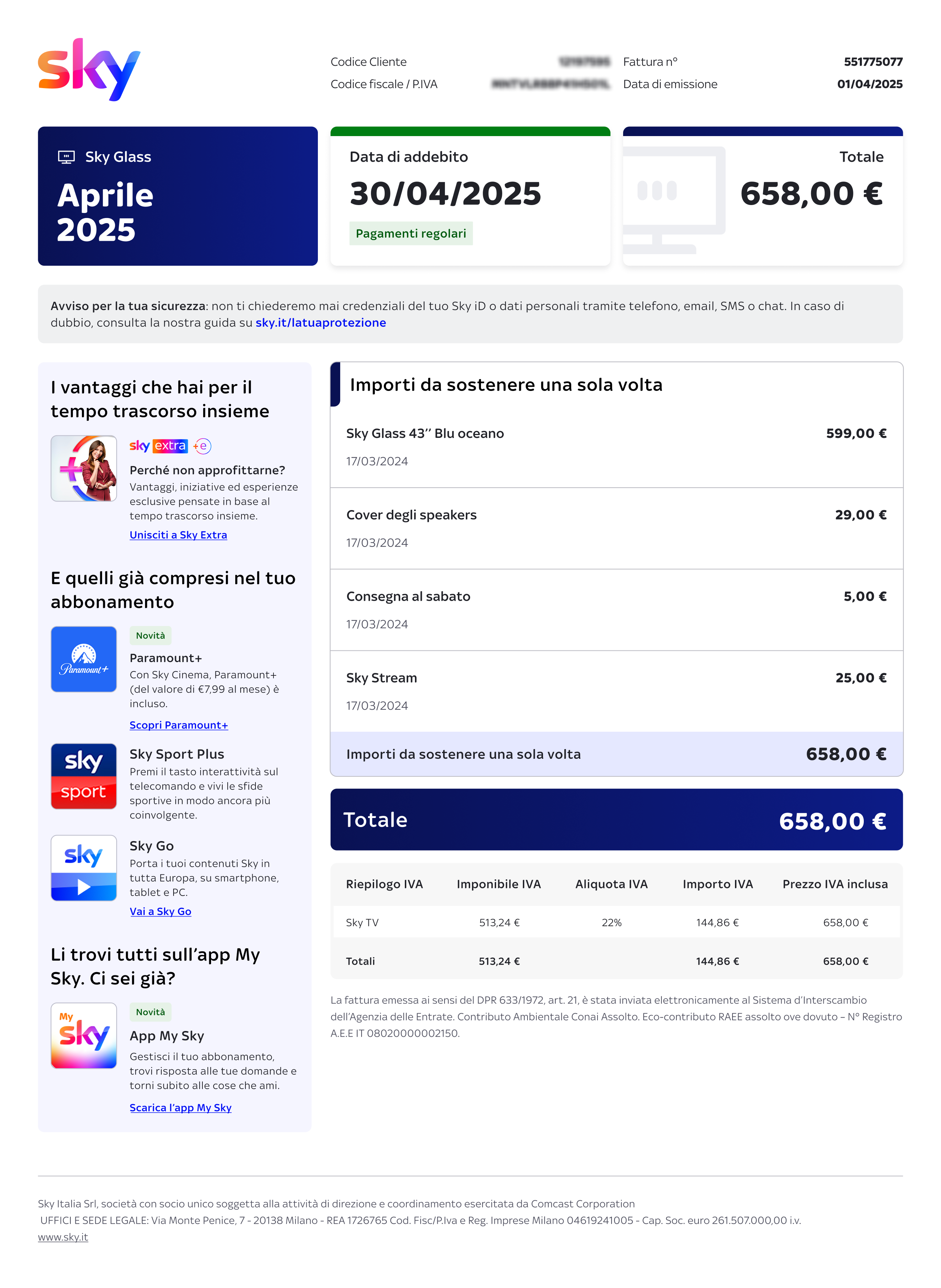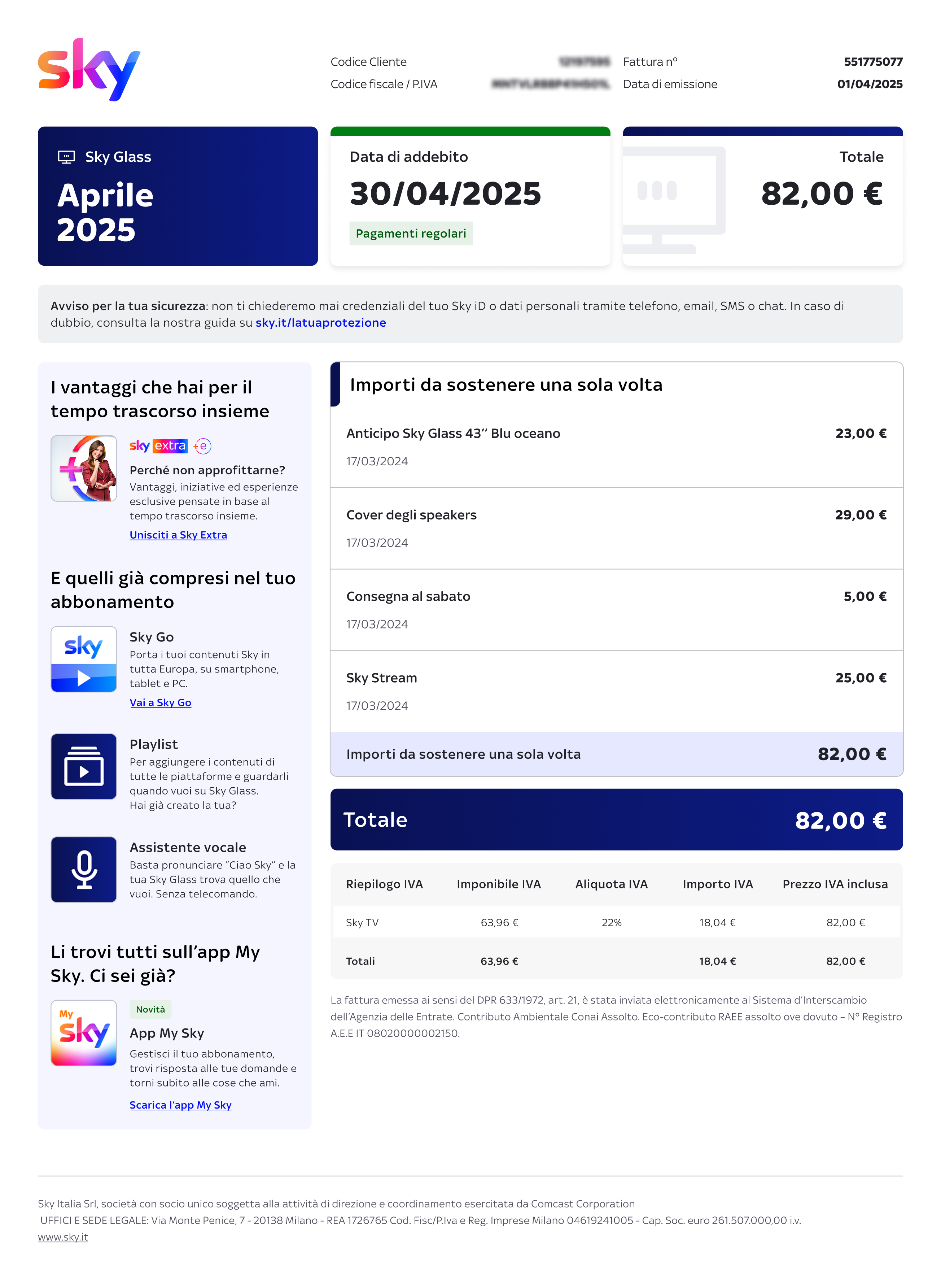 Al momento della spedizione ricevi la fattura dell' anticipo versato per l'acquisto di Sky Glass.