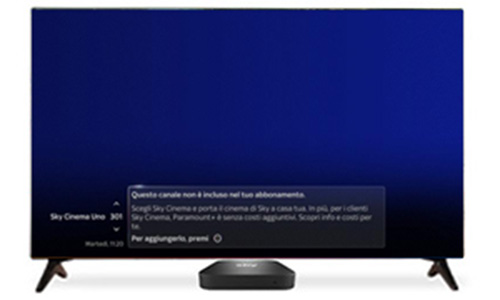 Se sullo schermo appare il messaggio Questo canale non è incluso nel tuo abbonamento , può dipendere da eventuali modifiche fatte al tuo abbonamento, come la disattivazione di un pacchetto Sky, oppure significa che il canale che stai provando a guardare non è compreso nel tuo abbonamento Sky .